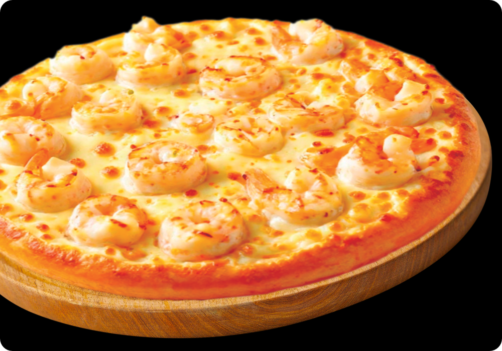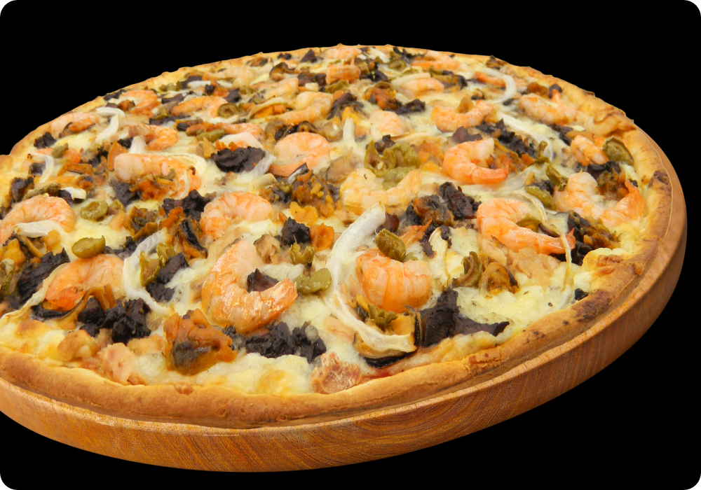 Pizza especial de mariscos con camarón, atún, cebolla, jalapeños y aguacate.